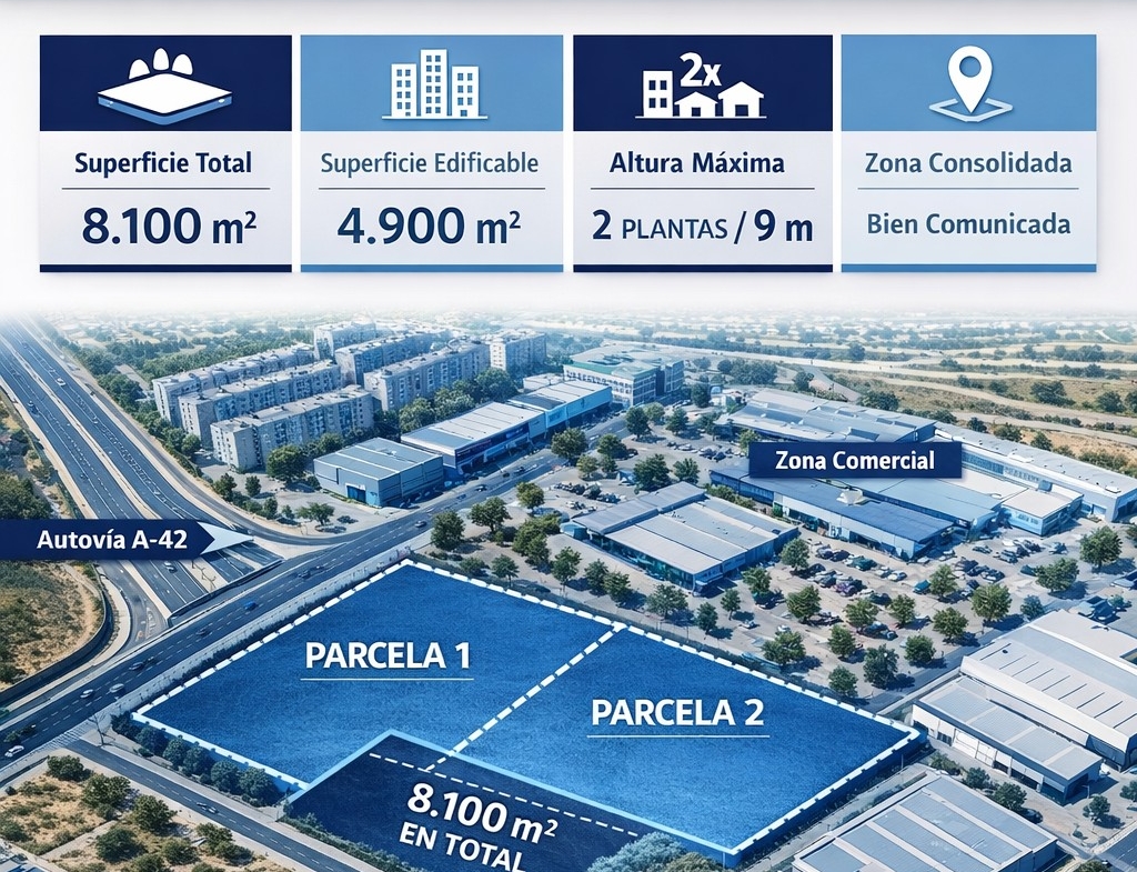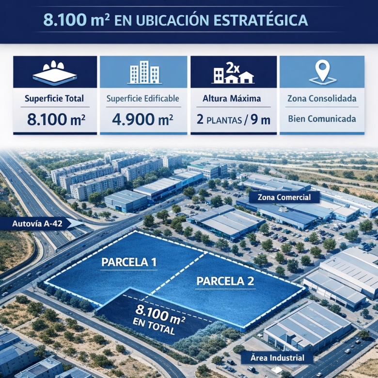 El terreno cuenta con una superficie total aproximada de 8.100 m² y una edificabilidad cercana a los 4.900 m², permitiendo una altura máxima de dos plantas (9 m). Estas características lo convierten en una opción muy interesante para el desarrollo de proyectos industriales, comerciales o de servicios, con un planteamiento flexible y adaptable a distintas tipologías de negocio.
